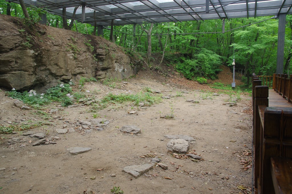 写真13は、居住建築群遺址です。20余りの半地下穴式住居址です。兵舎と推測されています。