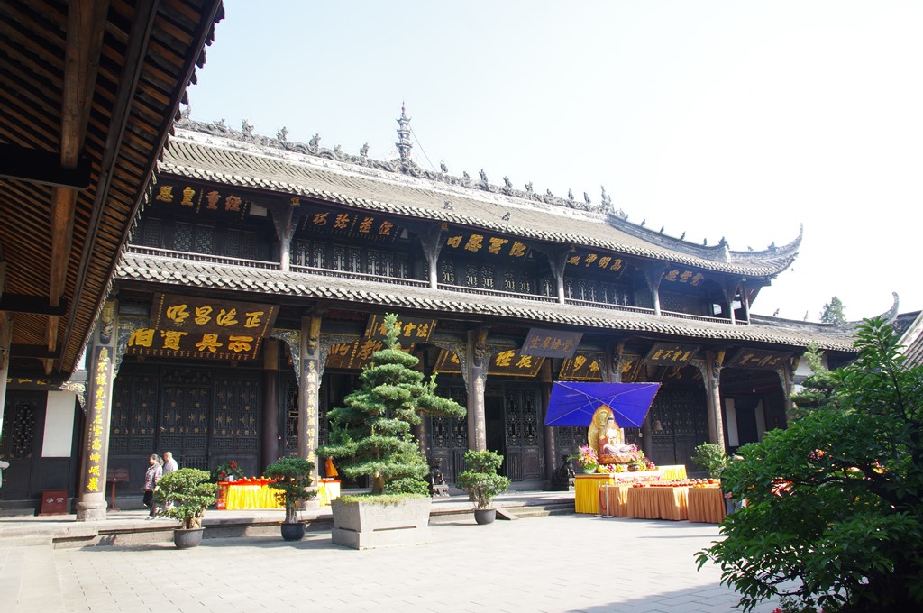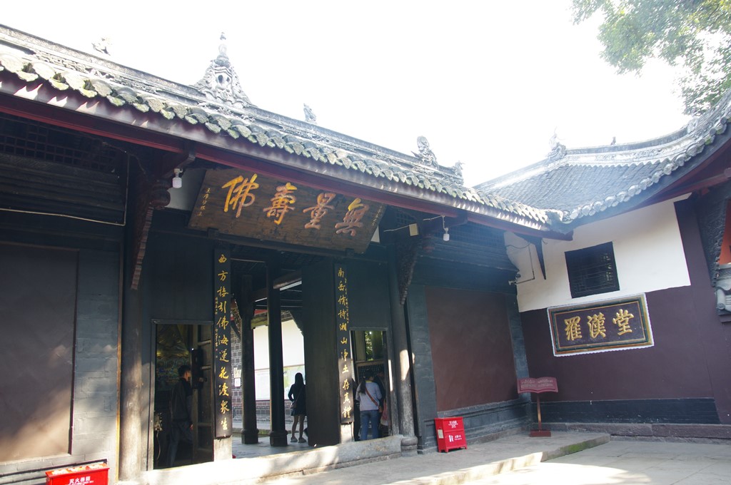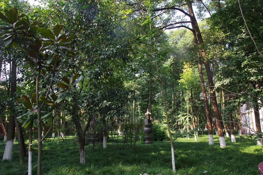 宝光寺は後漢創立と伝えられ、最初「大石寺」と称していました。史書の確実な記載の最初は唐代の開元元(713)年ですから、伝えはともかく、1300年あまりの歴史をもつ古刹です。唐末の黄巣の乱で、四川に逃れた僖宗が当寺を行宮として滞在し、この関係で寺と舎利塔を建て直し、中和元(881)年、寺名も「宝光寺」と改められました。宋代に最盛を迎えましたが、明滅亡の崇禎年間(1640~4年)の兵火で全山焼失し土台のみが残りました。清代の康煕9(1670)年に再建されて、その後、増改築がなされ現在の姿に到っています。