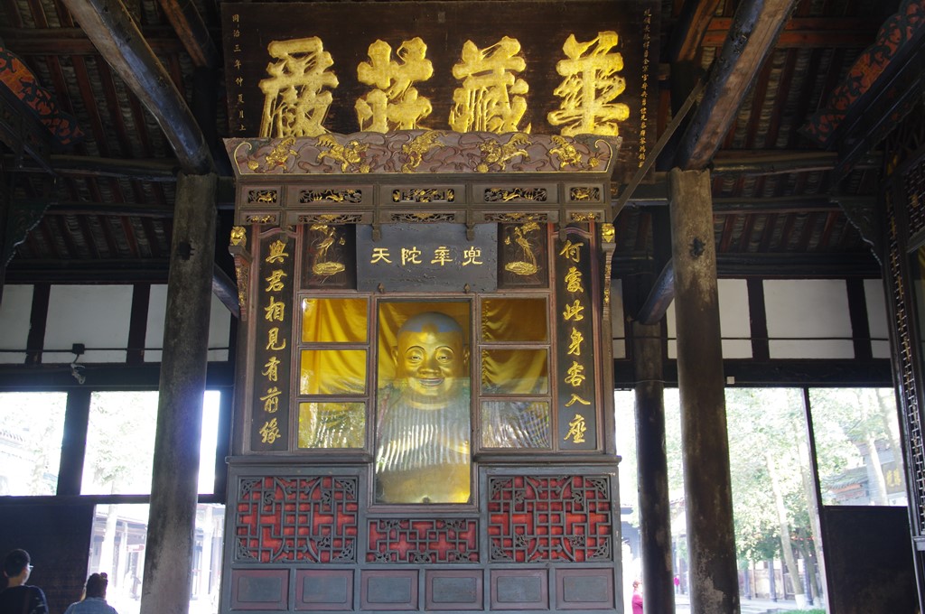 写真10は、一番奥にある蔵経楼です。蔵経楼は高30m・延面積約1000㎡で、道光28(1848)年の再建です。楼2階が蔵で大蔵経336冊以下が納められています。楼1階は法堂となっています。楼の左右には東・西方丈が接しています。西方丈北側の西花園にチベット仏教ゲルク派の創始者ツォンカパ(1357~1419)を捧持した密壇があり、四川の仏教界とチベット仏教の関係が深いことが察せられます。