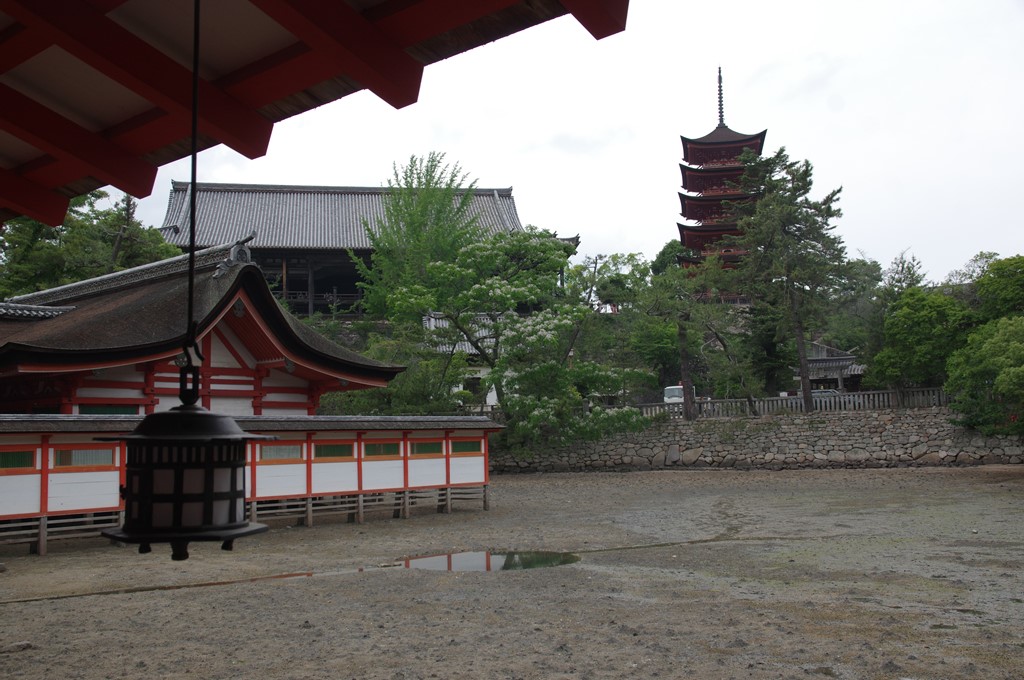 写真4は、鏡の池です。満潮時には海水が入り池となります。奥に見えるのは左が千畳閣、右が五重塔です。