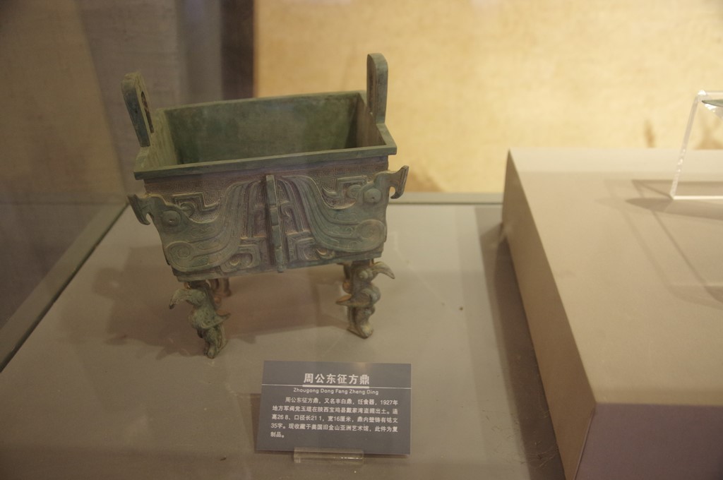 写真3は、周公正殿の前殿である献殿内での発掘展示の周公東征鼎です。他に新邑戈等が展示されています。献殿の前には周公立像があります。