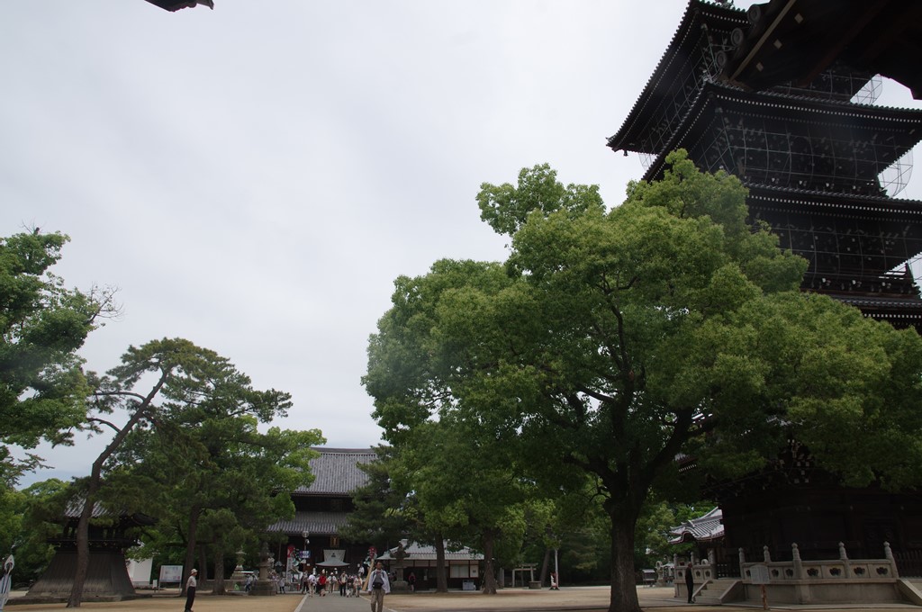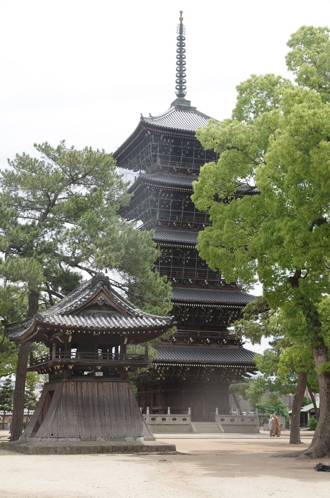 写真4は、中門を潜り伽藍(東院)に入り、右手に見える鐘楼と高約43mの五重塔(重要文化財)です。