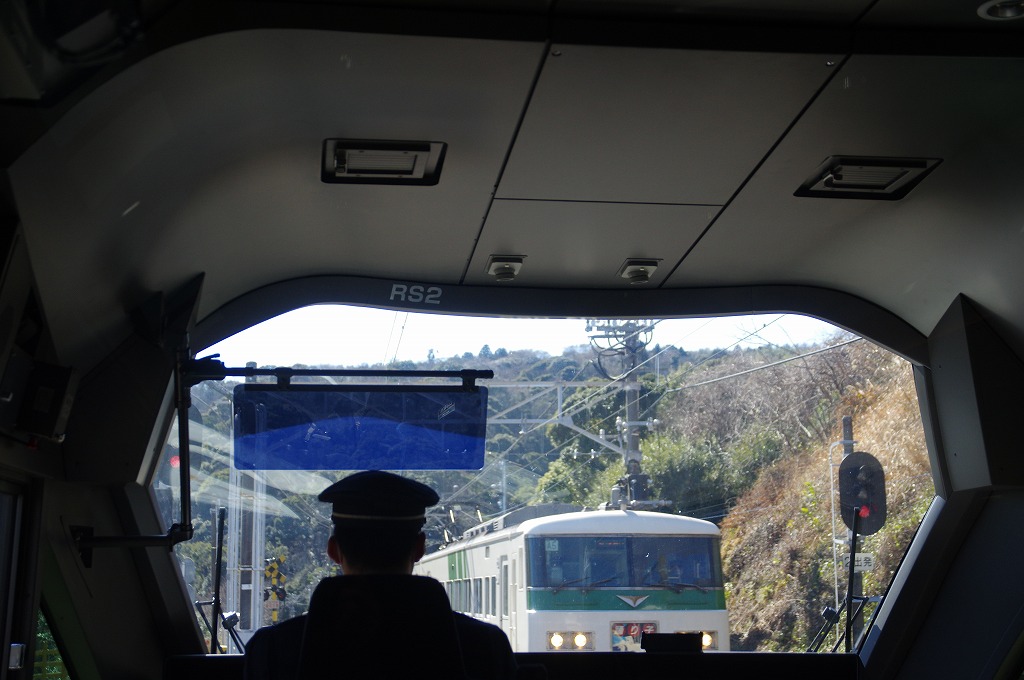 写真2は、川奈駅での運転台を通した前方風景です。入線してきたのは上りの踊り子8号です。