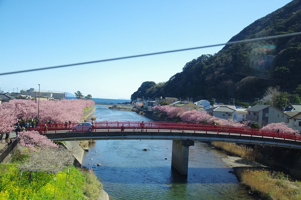 写真7は、河津駅を出て運転台越しに前方に川津桜を捉えたものです。