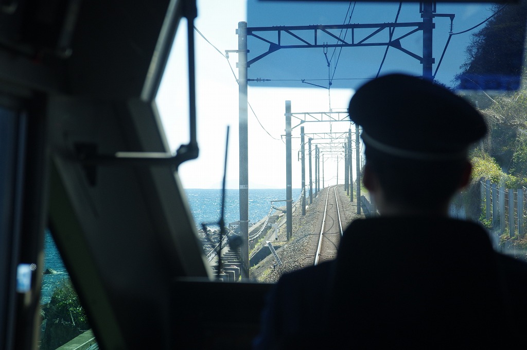 写真4は、海岸線に沿って走る片瀬白田・伊豆稲取間での運転台越しの前景です。