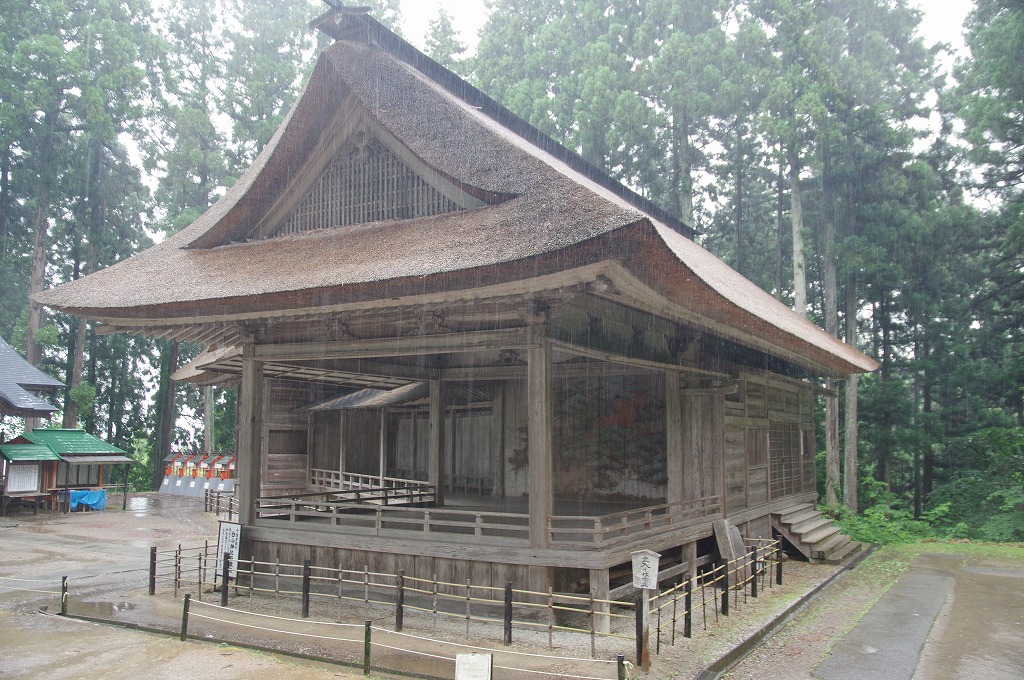 写真6は、重要文化財の白山神社能楽殿です。白山宮(神社)は清衡が本寺の北の鎮守として造営したものです。能楽殿は嘉永6年(1853)に伊達藩主慶邦が再建寄進したものです。