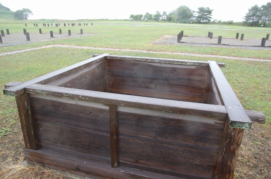 写真6は、付属建物群の東に接した竪穴建物跡です。東西7m・南北8mの竪穴に柱を立てた建物です。北側と東側に張出しがあります。