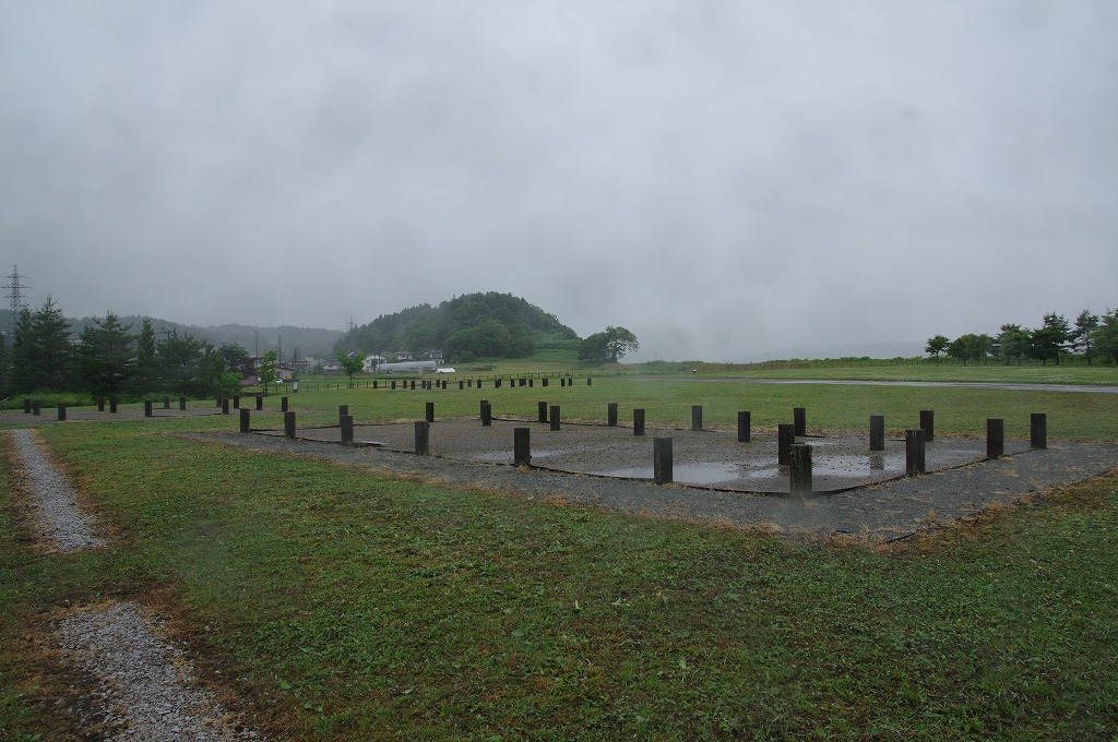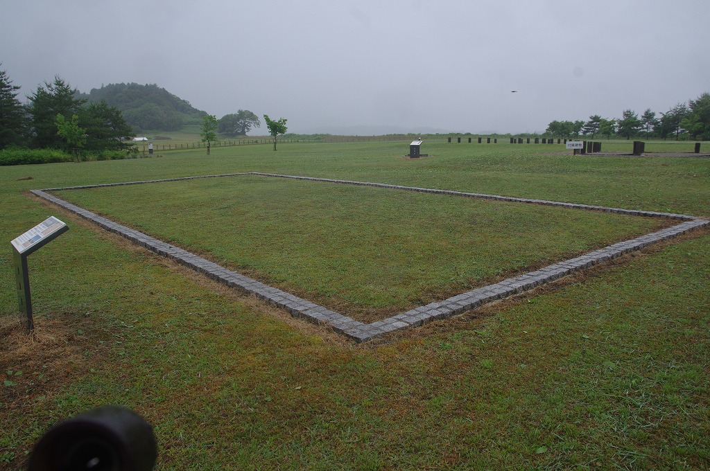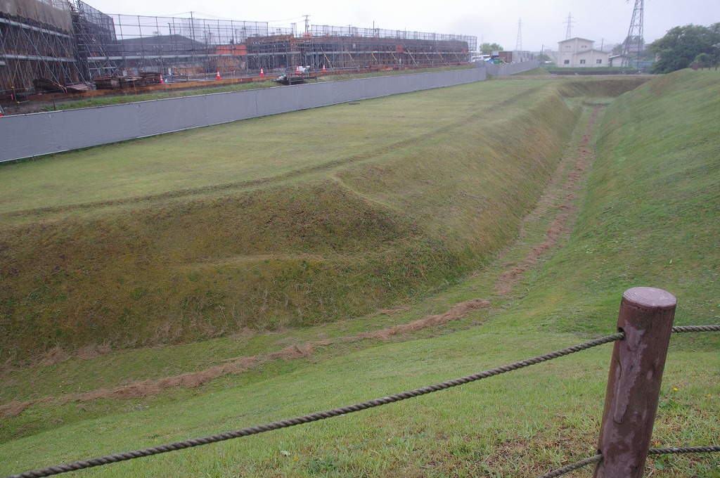 御所の周囲には2本の空堀があります。ただ、時期が異なり併存していたわけではないようです。発掘では約500mの空堀が確認されています。写真16は、御所南東側の内側の堀跡で、復元整備したものです。幅14m・深さ4mの大きなものです、3代秀衡期には南側では内側の空堀で囲まれていたと考えられています。なお、後方の建築中の建物は展示館等です。