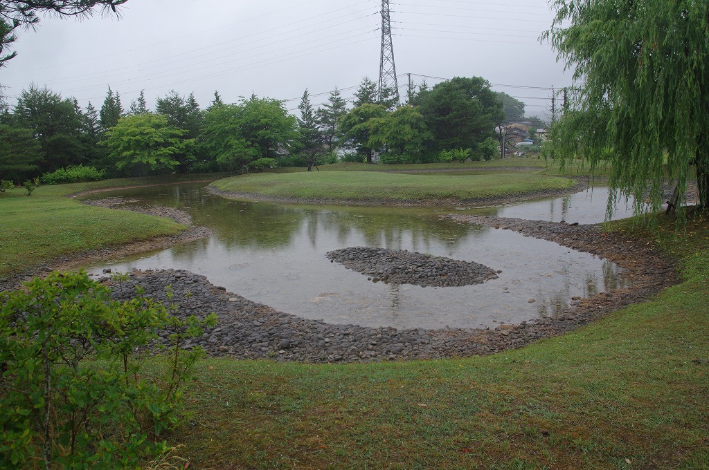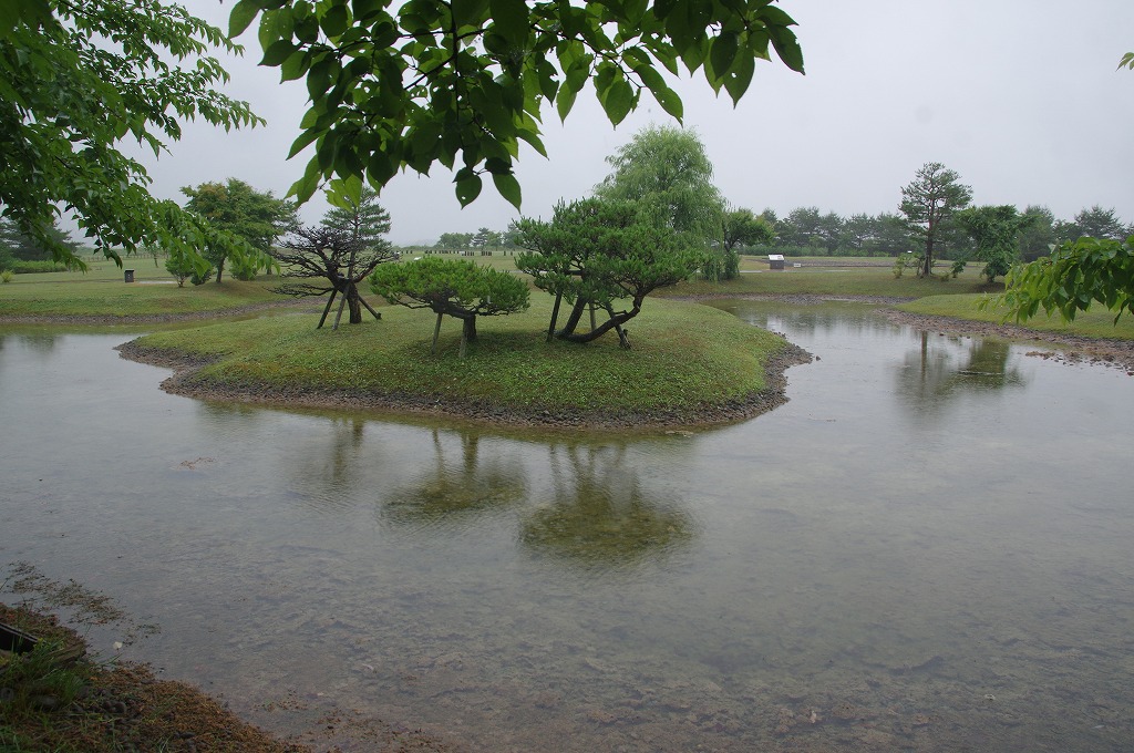 写真12は、中心建物跡の南西に位置する園池を北から撮ったものです。新・旧2時期の池があり、新しい方を復元整備したものです。大きな中島があります。