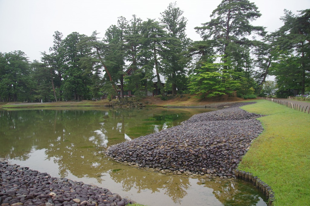 写真6は、池の北西端から撮ったものです。池南側中央が築山で、その奥が1989年に再建された本寺本殿です。