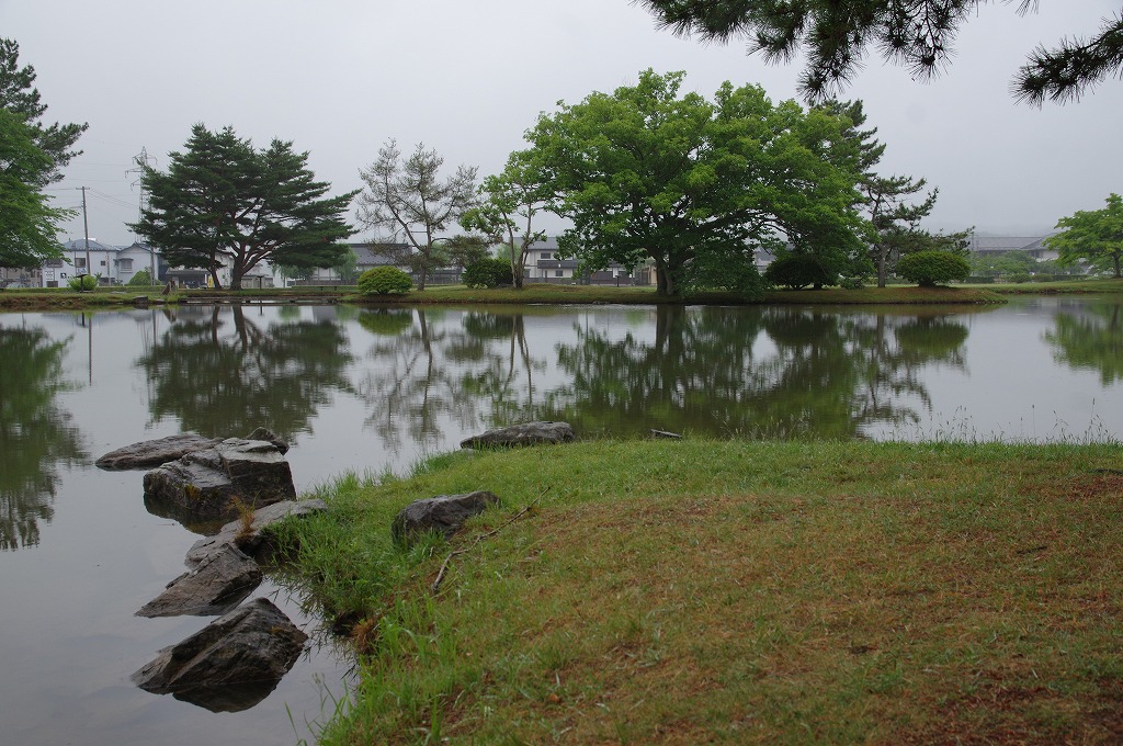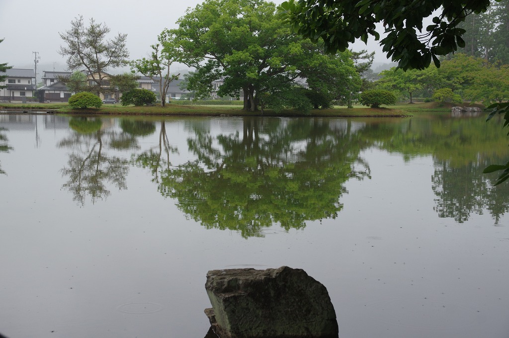 写真7は、北からの中島です。手前に池に石が据えられています。