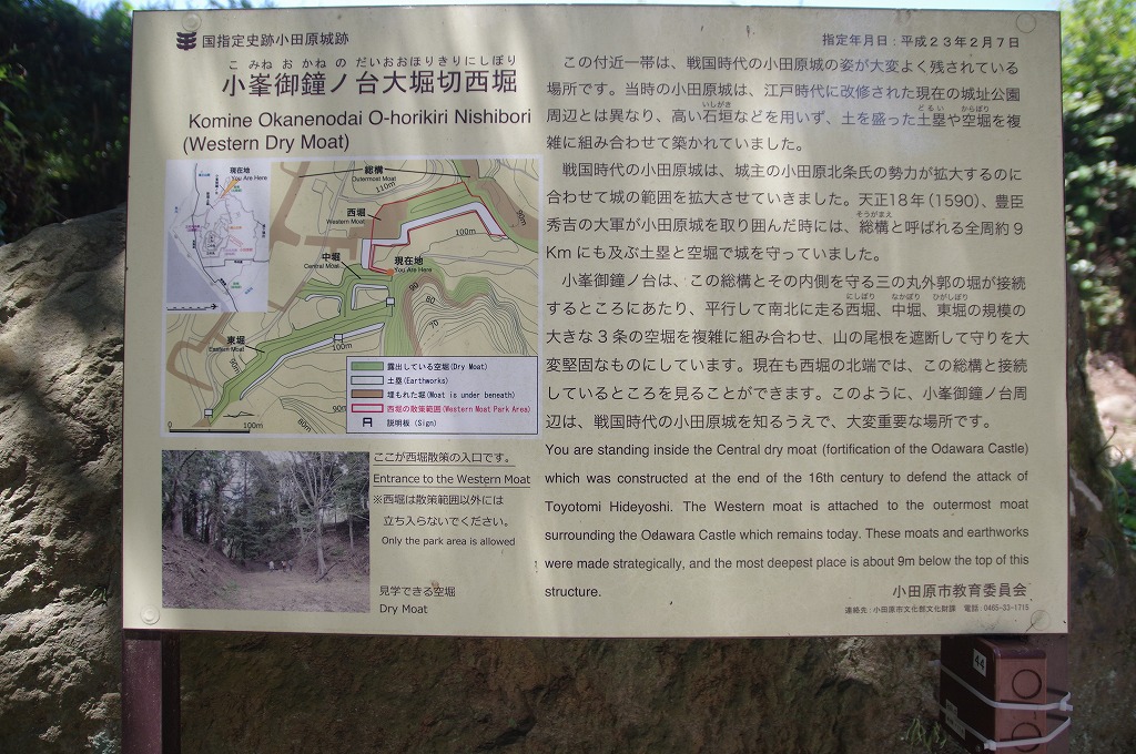 八幡山古郭に次いで、小峯御鐘ノ台大堀切を訪れます。県立小田原高校を左手(南)に見、さらに城山公園を過ぎると、左手(南)に小峯御鐘ノ台大堀切東堀に至ります。さらに少し進むと、小峯御鐘ノ台大堀切西堀の案内板が下にある上り道に出ます。そのまま少し進むと、「総構」と「小峯御鐘ノ台大堀切西堀」説明板の立っている所に至ります。写真1が、これです。西堀は天正18年(1590)の小田原合戦への備えとして総構と共に造られたものです。