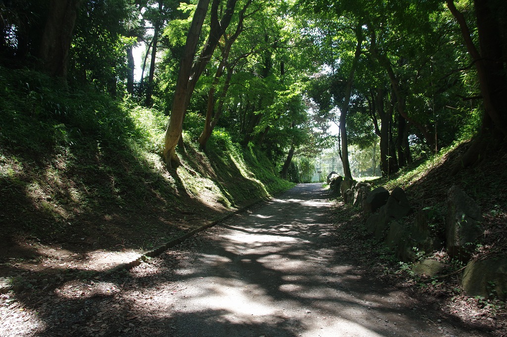 道を戻り、小峯御鐘ノ台大堀切中堀に来ます。中堀も西堀と同じく天正10年の小田原合戦への備えとして造られたもので、東堀の西に接して掘られて、この間は土塁となっています。写真10は、少し入った所で、南へと中堀を撮ったものです。ご覧のように堀は道路として利用されています。