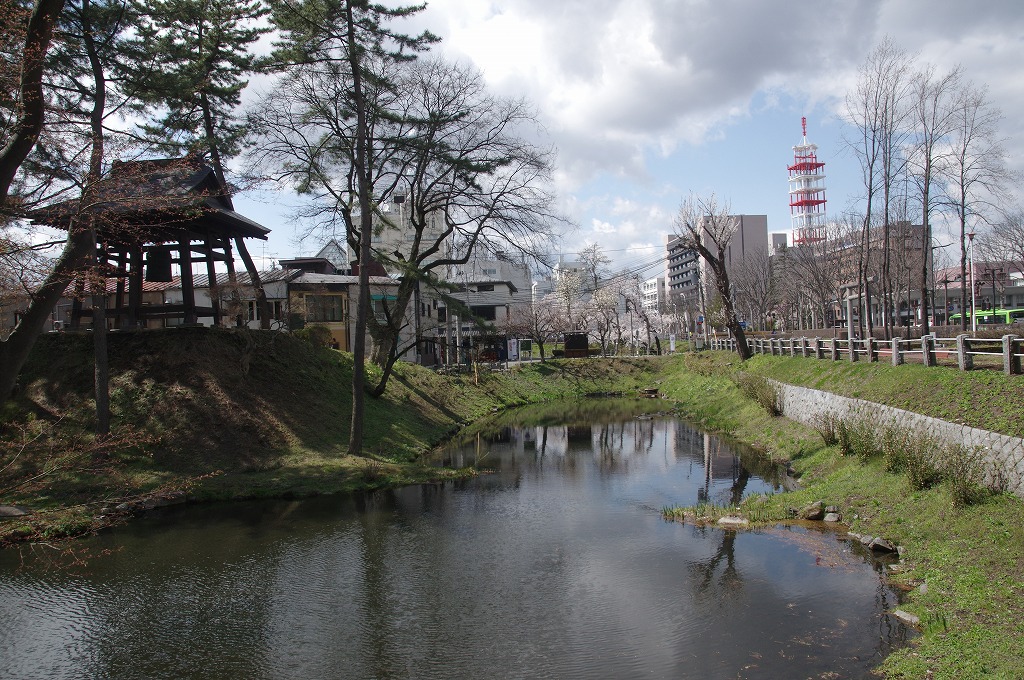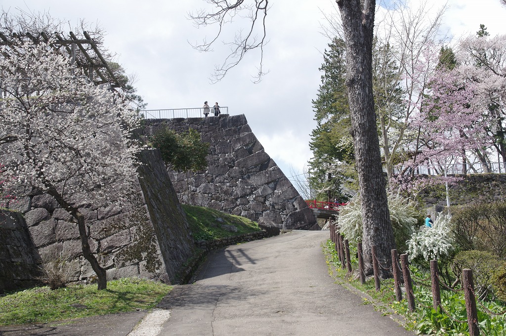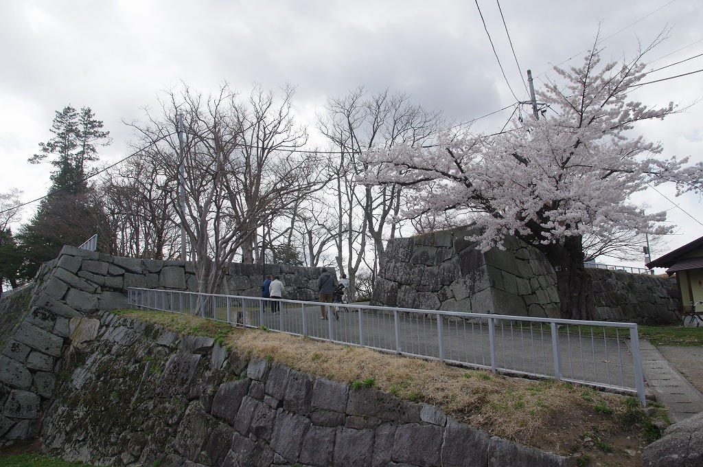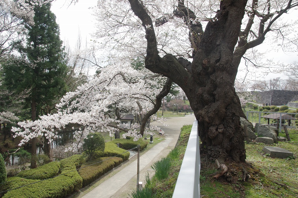日本百名城である盛岡城の内曲輪(御城内)は盛岡城跡公園(盛岡市内丸1番37号)となっており、桜の名所でもあります。そこで、2021年4月15日(木)昼、観桜に出かけました。盛岡城は、南部利直により慶長年間(17世紀初頭)には総石垣の城としてほぼ完成し、3代藩主重直の寛永10年(1633)に完成しました。西を古北上川に接し、東に中津川の合流点に位置する花崗岩丘陵に築かれた連郭式平山城です。本丸の北側に二ノ丸・三ノ丸が配され、本丸と二ノ丸の間は空堀で仕切られ、現在は朱塗り橋(渡雲橋)が架かっていますが、当時は本丸御殿と大書院を結ぶ廊下橋が架けられていました。本丸を囲むように南から東へと腰曲輪・淡路丸・榊山曲輪が配されました。明治維新によりほとんどの建物が解体されて現在に至っていますが、石垣はよく保存されて威容を誇っています。