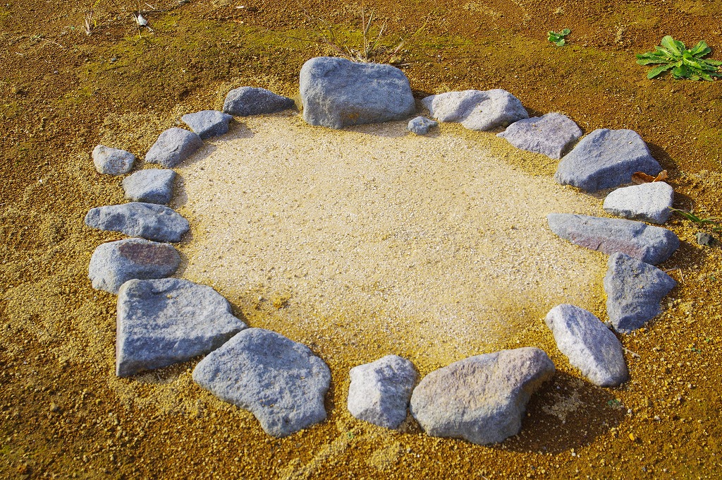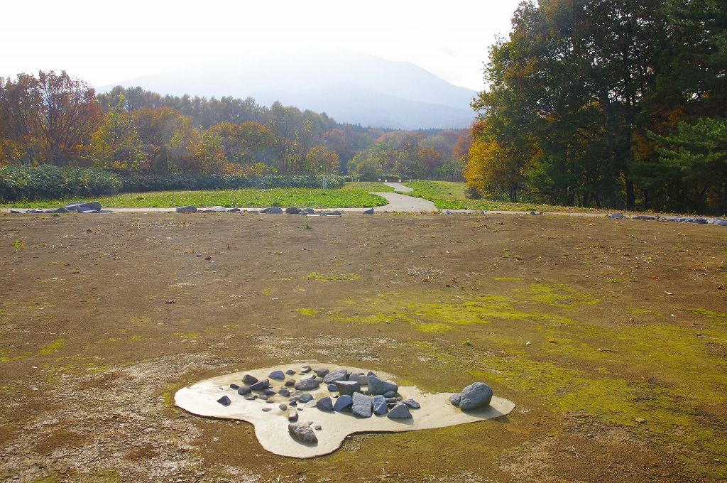 写真1は、環状列石の外側にある屋外炉です。本遺跡は発掘調査後に埋戻し、表面土上に移行をレプリカ展示しています。同型同質の石を用いています。