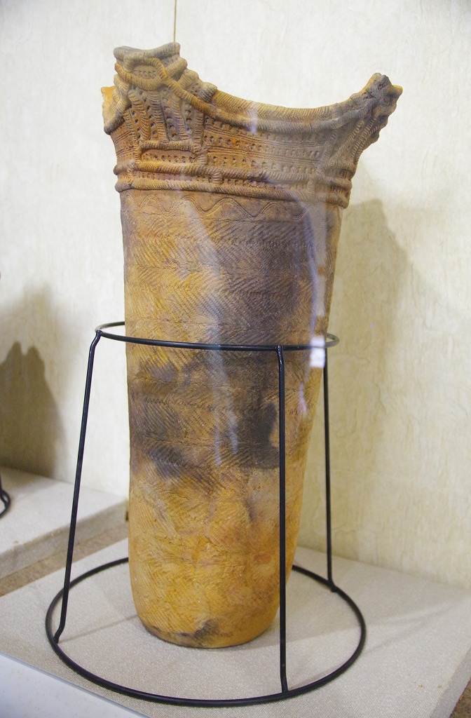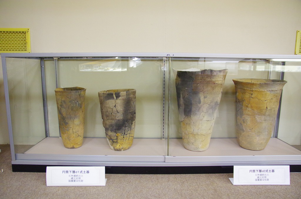 昼食後の最初の見学地のつがる市森田歴史民俗資料館(青森県つがる市森田町森田月見野340−2)には14時に着きました。本館の西南約1kmに位置する縄文前・中期の石神遺跡(つがる市森田町床舞石神地内)出土品を中心に展示をしています。本遺跡では円筒土器が層位的に順序正しく出土しました。