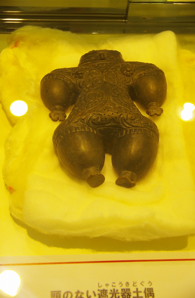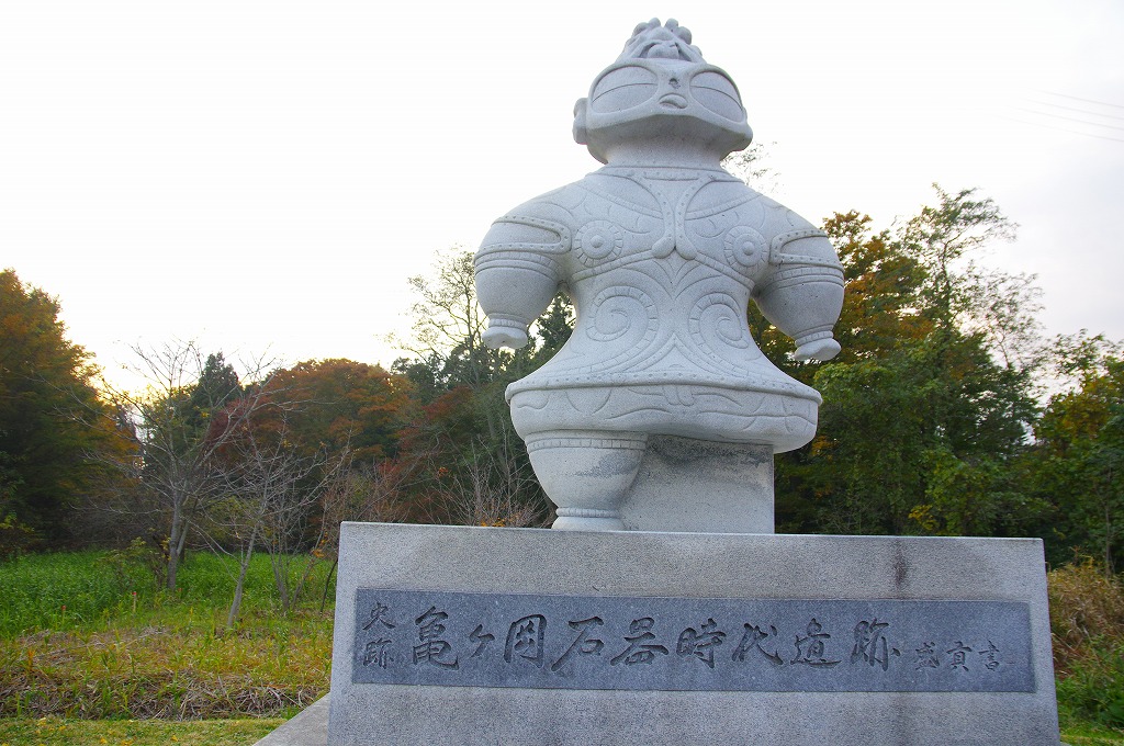 写真2は、遺跡入口に立てられている、遮光器土偶モニュメントです。