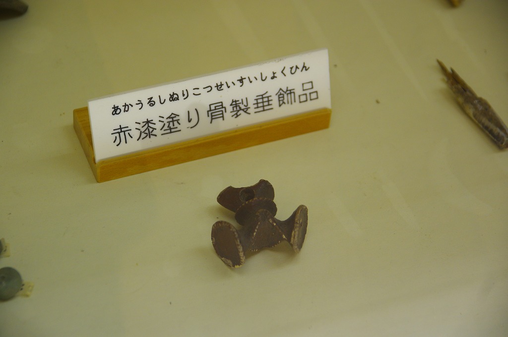 写真7は、頭のない遮光土器です。亀ヶ岡遺跡の北側の低湿地、近江野沢から出土した縄文晩期前半のものです。ベンガラと考えられる塗料で赤く、中は中空です。