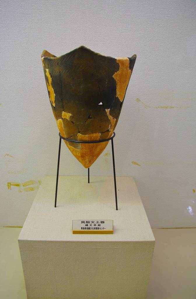 写真13は、縄文早期の貝殻文土器です。青森県埋蔵文化財調査センター所蔵です。