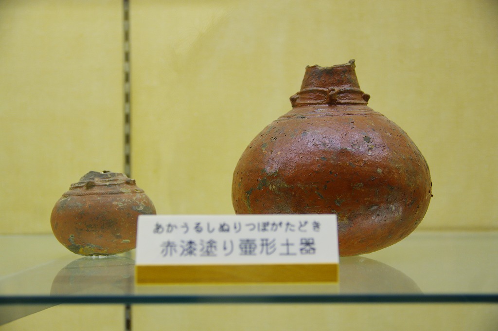 写真5は、赤漆塗り壺型土器です。1982年の発掘品です。