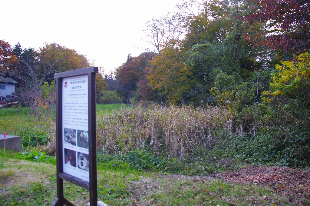 2021年11月7日(日)、つがる市森田歴史民俗資料館から次の見学地、縄文晩期の集落遺跡である亀ヶ岡遺跡(青森県つがる市木造亀ケ岡)に14時55分に到着しました。写真1は、本遺跡出土品を代表する遮光器土偶(重要文化財 東京国立博物館所蔵)の出土地です。ただし、考古学的調査により発見されたのではなく、地元民の発見のため、正確な出土地は不明で、この低湿地内ということです。17世紀前期の築城により遺物が発見され、以後地元民等が遺物を発掘し、好事家に知られるようになりました。1889年(明治22年)に初めて学術調査が行われて現在に至っています。この一帯の低湿地から土器・石器等の多数の遺物が出土しました。