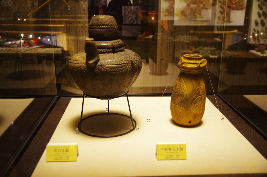 写真12は、注口土器(臼尻遺跡 中期)と下離有花土器(臼尻遺跡 中期)です。