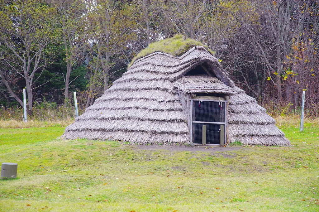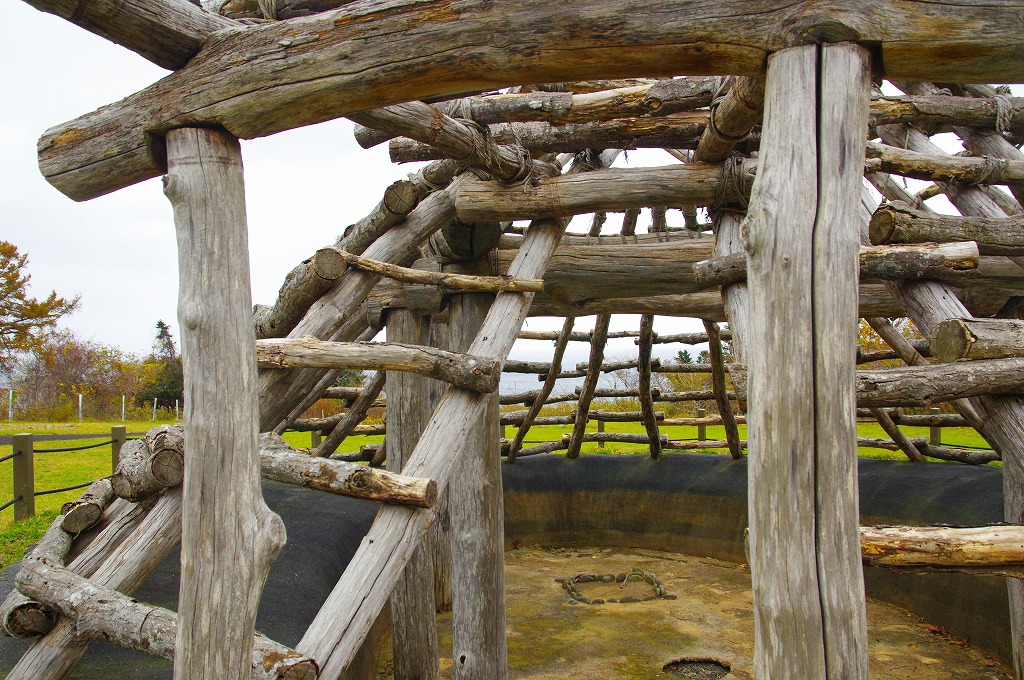 写真3は、枠のみの復元竪穴住居です。