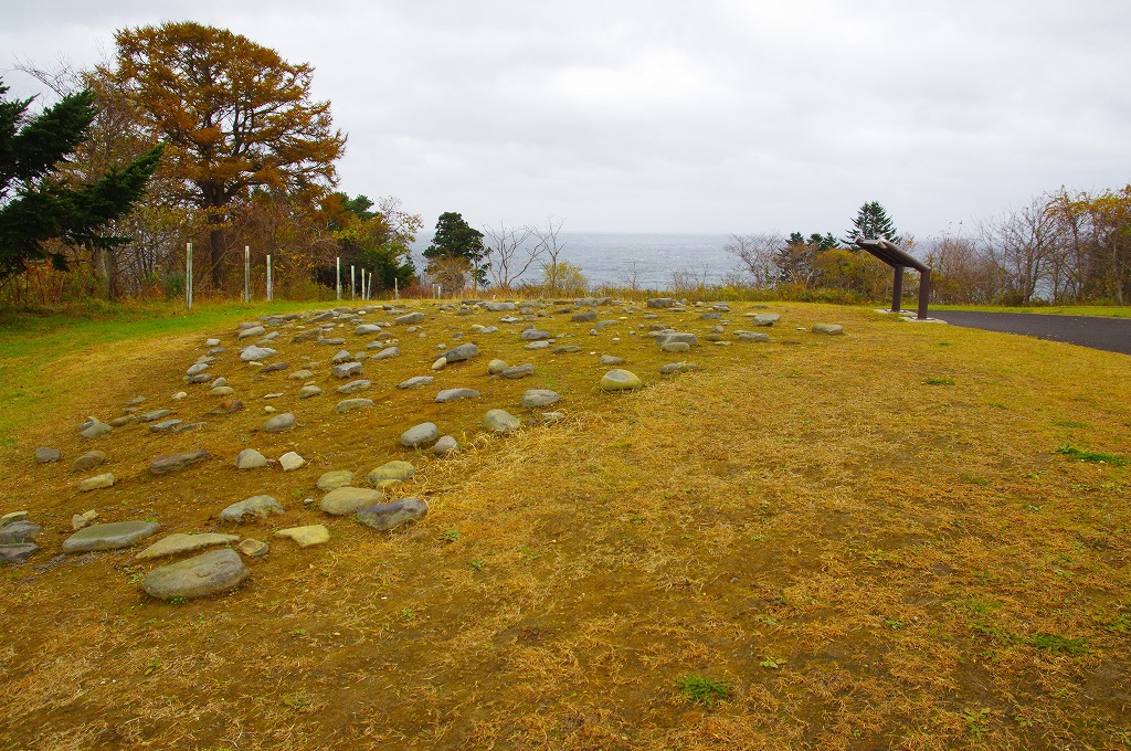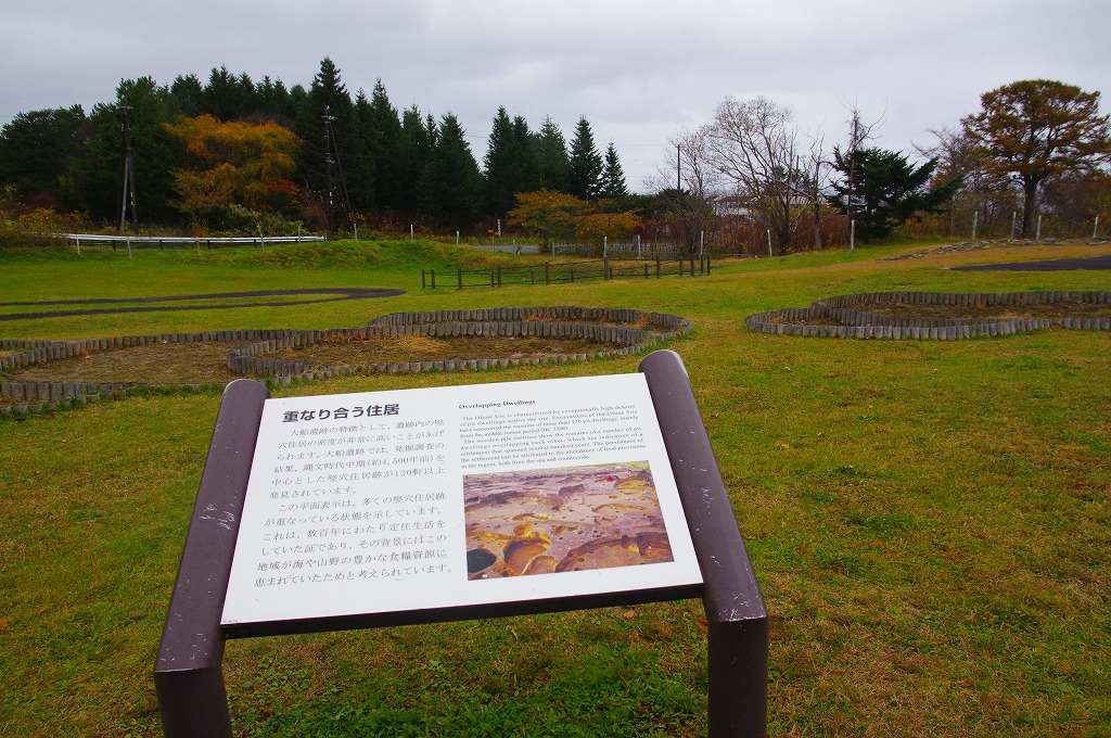 2021年11月9日(火)、8時に出発し最初の見学地大船遺跡(北海道函館市大船町575−1)に8時45分に着きました。本遺跡は大船川沿岸の標高30~50mの海岸段丘上にあり、縄文中期の大型集落跡です。100棟を越える竪穴住居跡と盛土からなる居住区と、南西に墓・貯蔵穴を含む100基以上の土坑群が確認されています。