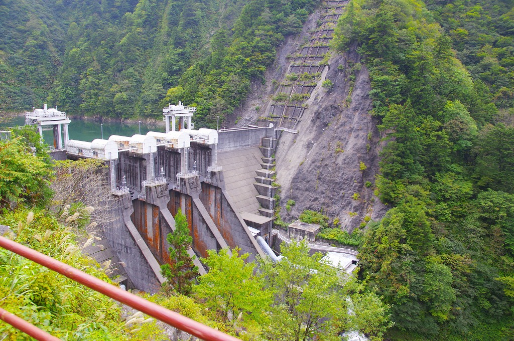 写真7は、うなずき湖です。正面に湖面橋とその奥に宇奈月ダム堰堤が見えます。