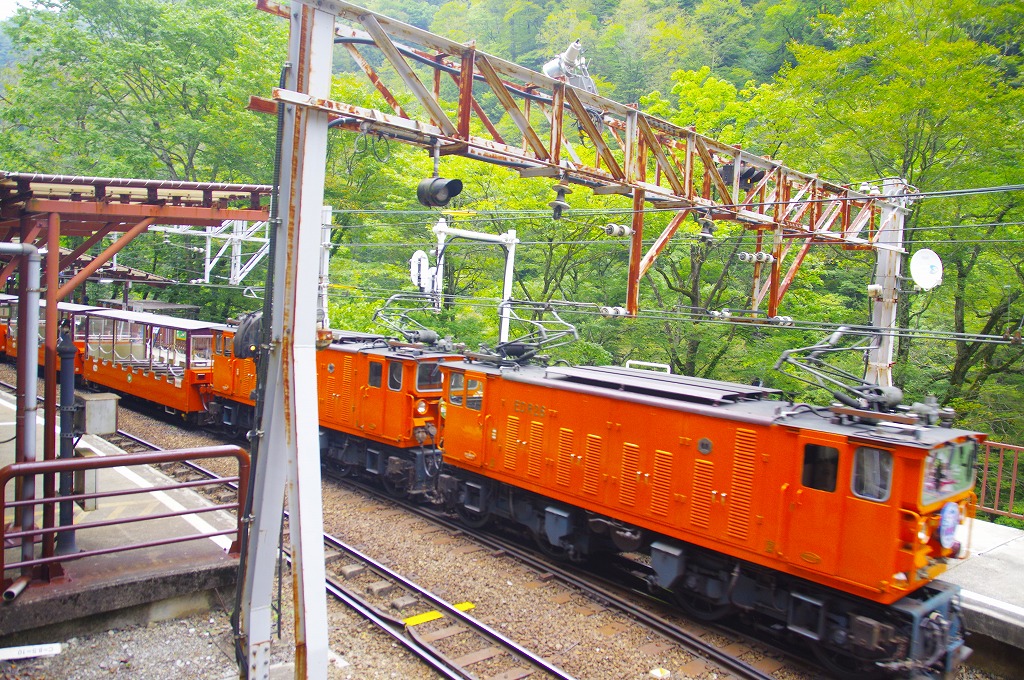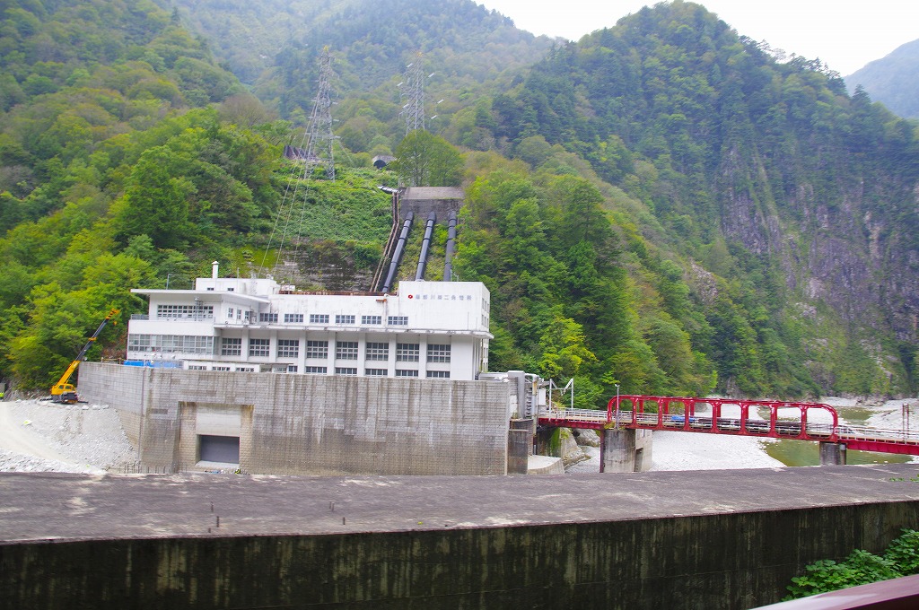 東京駅7時24分発北陸新幹線あさま603号で9時13分着長野駅着で到着後、バスで宇奈月湖畔に移動しました。12時過ぎで、おりから黒部峡谷トロッコ列車が通過し、その写真の一つ、新柳河原発電所と共にトロッコ列車を写し込んだのが、写真1です。