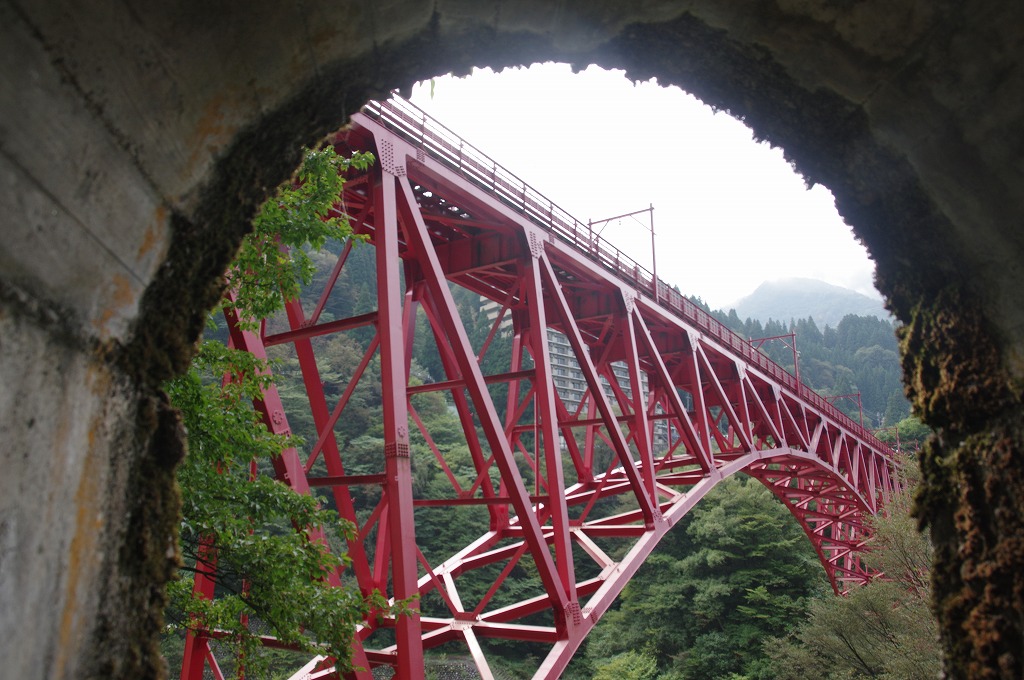 やまびこ遊歩道へと下り、見上げて黒部峡谷鉄道の新山彦橋を撮ったのが、写真3です。