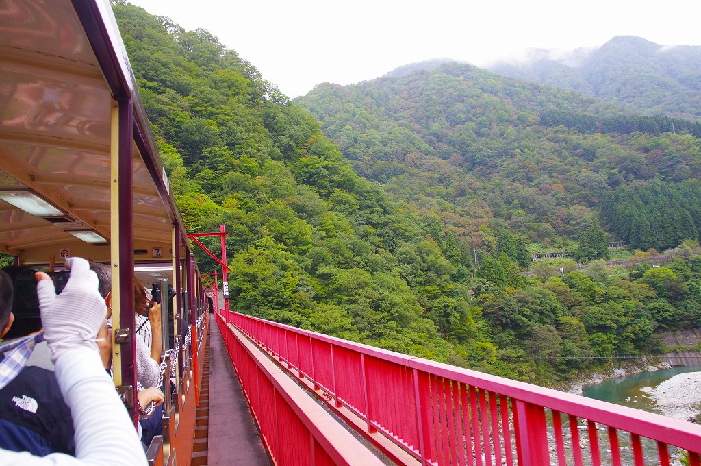 16時21分発の上りで宇奈月へと戻ります。最後の写真16は、新山彦橋を通過中に撮ったものです。左は橋を見下ろせるクリスタルバリー宇奈月です。バスでホテルのある栂池へ向かい、19時過ぎに到着しました。