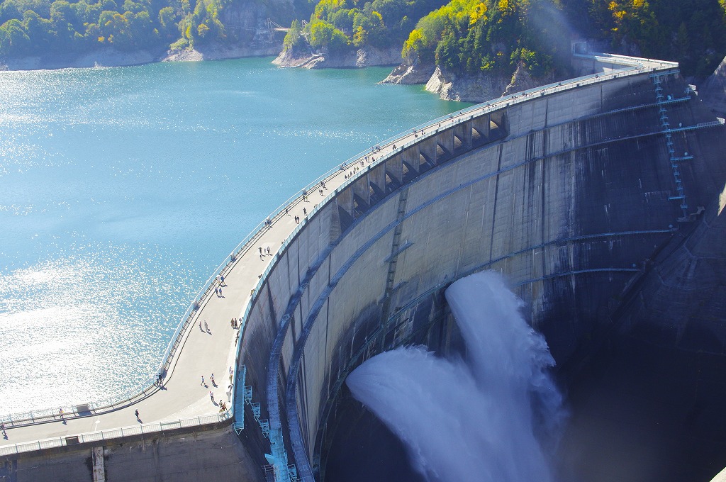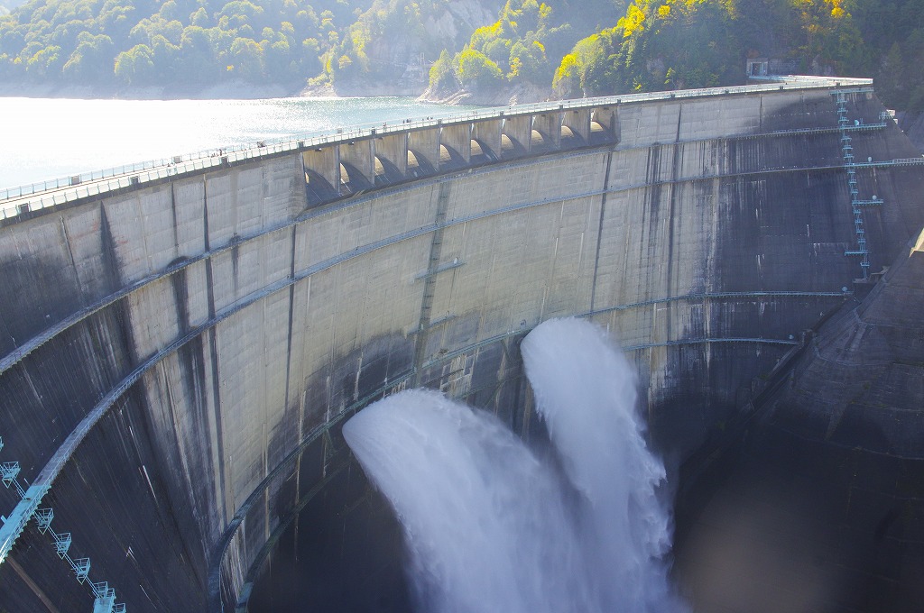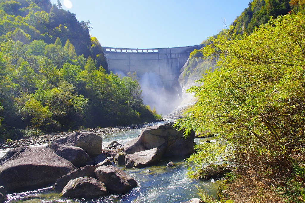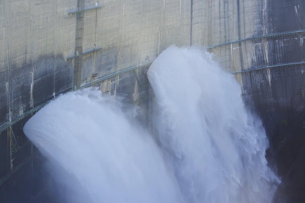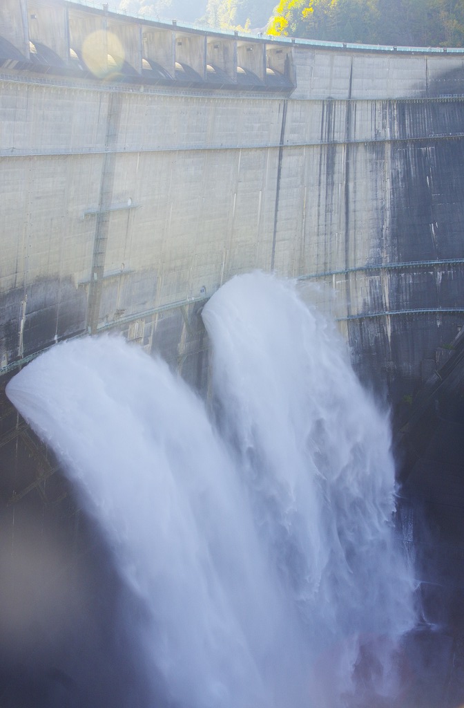 写真2は、ダムを拡大して縦位置にしたもので、放流の様が分かります。