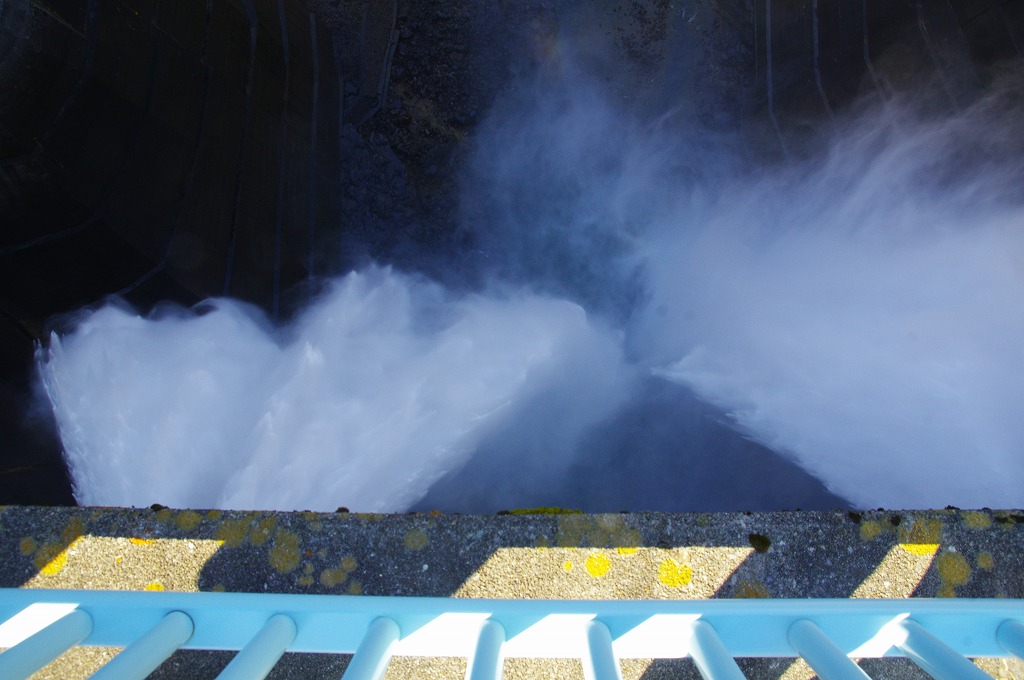 写真11は、ダム堰堤上から横に放流を見たものです。