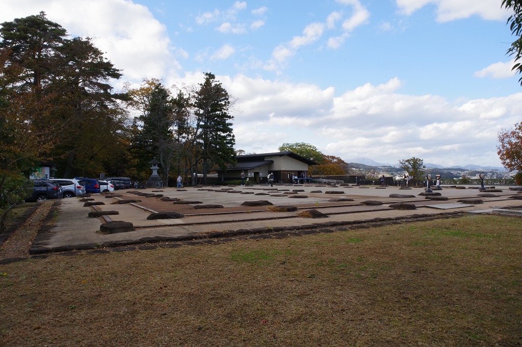 写真7は、反対方向から伊達政宗騎馬像を入れての本丸大広間跡遺構表示です。