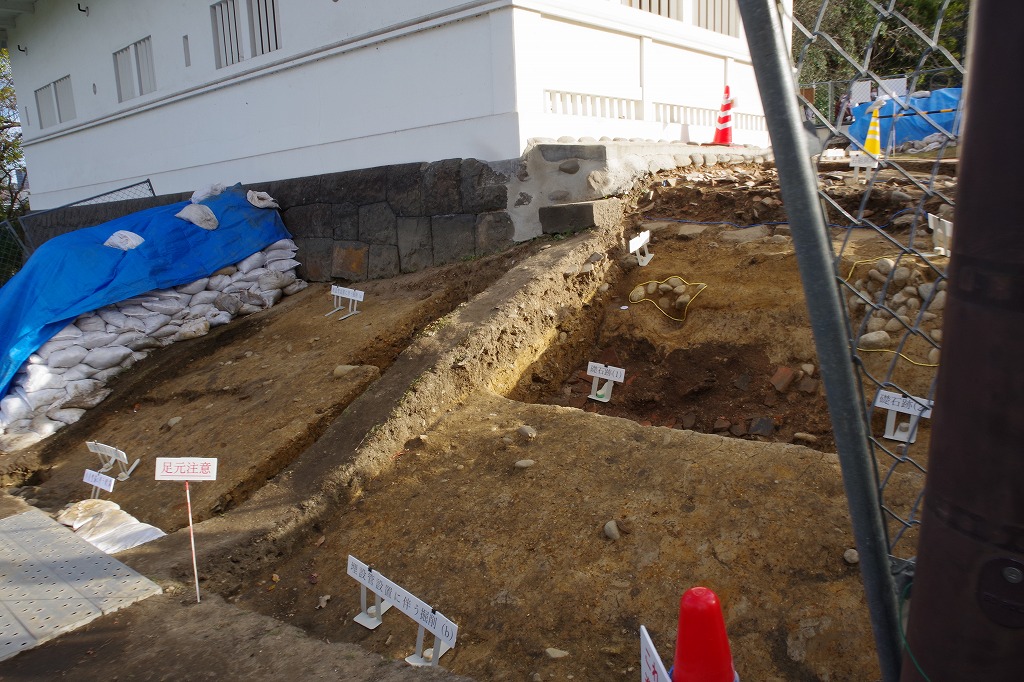 大手門復元を見通した発掘調査を本年から行ない、本日午後、「大手門跡および周辺発掘(第1次)遺跡見学会」が開かれました。ちょうどこれに出会い撮ったのが写真14です。写真に見るように礎石跡が確認され、3か所に及びます。大手門南面には5本の柱があり、写真の礎石跡は他の遺構からと合わせると2~4番目の南面柱跡に相当すると推測できます。