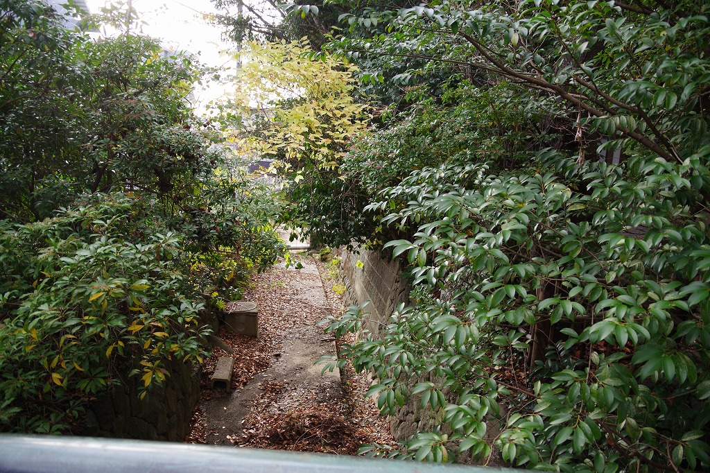 写真2は、藩時代に整備された四ッ谷用水跡です。大階段下の橋のところから下流を撮ったものです。