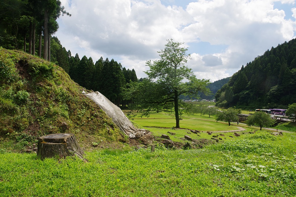 写真9は、館奥から主殿遺構、正門、土塁を見たものです。土塁はご覧のように下が石垣で覆われています。