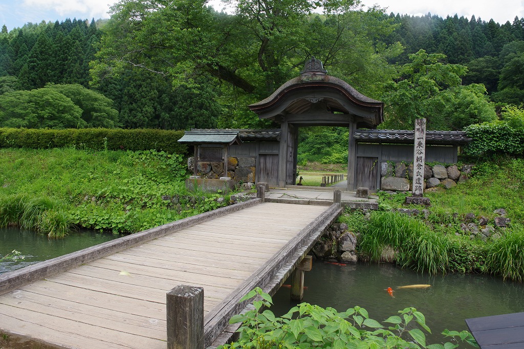 写真5は、朝倉氏館遺跡に、復元された正門(西門)です。館の前面は堀と土塁で囲まれています。