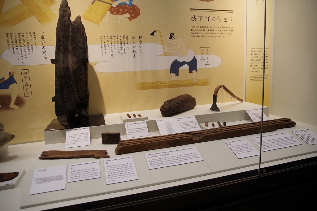 写真27は、建物関係の出土品です。下に左から板、柱です。奥は門柱、鏨、柱、釿(複製品)です。
