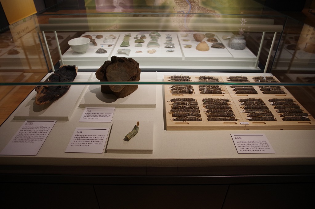 写真29は、貨幣関係の出土品です。右は武家屋敷から纏まって出土した銭で備蓄銭(重文)です。中はさし銭です。