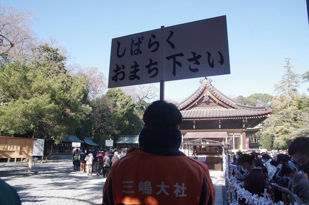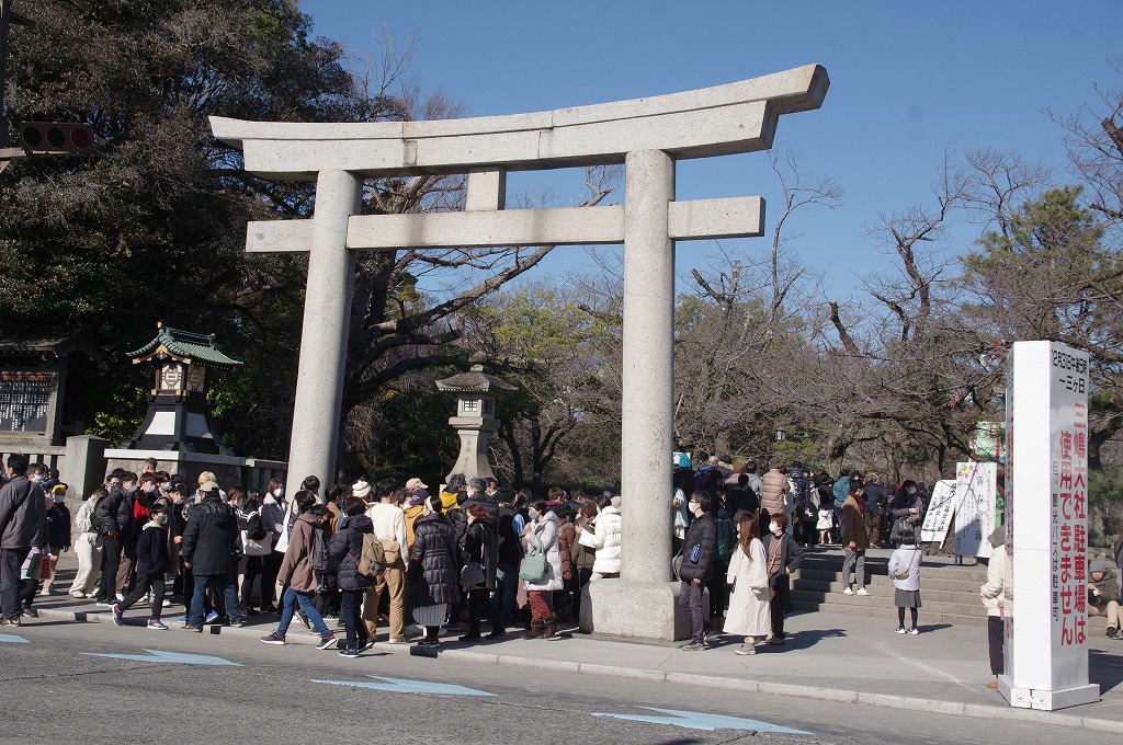 2023年1月1日(日)、三嶋大社に初詣をしました。写真1は、大鳥居前からのもです。参拝者の列はご覧のように大鳥居から歩道の左側へと50m余も伸びていました。11時31分撮影です。