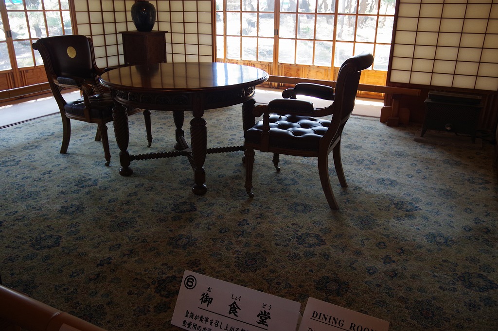 踊り子3号で10時13分に湯河原で下車し、バスに乗り、三島でウナ重の昼食後、最初の観光地の沼津御用邸に12時40分過ぎに着きました。沼津御用邸は1905(明治38)年に造営され、その後の増築を重ねて、1922(大正11)年に現在の姿になりました。(めいじ38)まず面積1270㎡の木造平屋建ての西附属邸に入ります。
