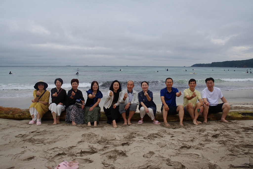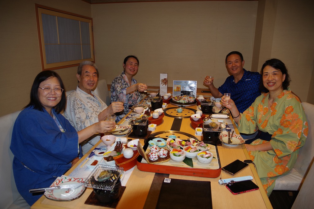 写真6は、波に浸かっている卒業生達です。中国では海に親しむ機会は少ないので、白い砂浜が綺麗な海岸として知られている多々戸浜を見下ろせるホテルを選んで宿泊地としたのです。それに温泉露天風呂付和室を選び、温泉も愉しみました。
