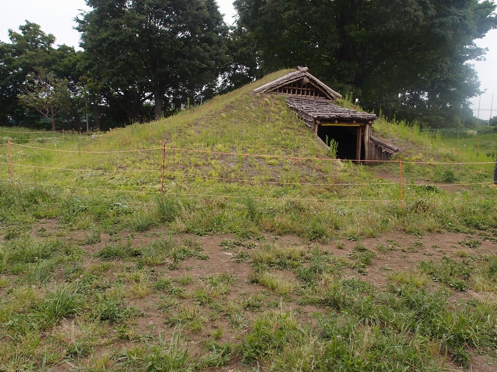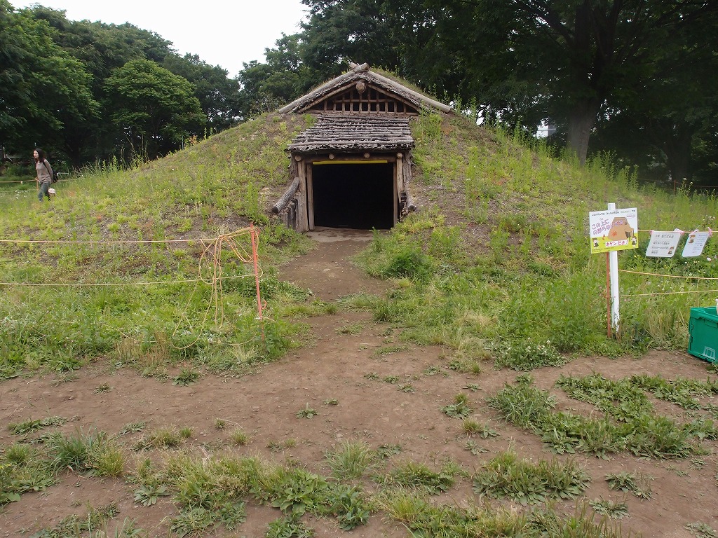 写真4は、正面から見た復元した竪穴式住居(1号住居)で、縄文時代中期中葉のもので、直径5.5mの円形深さ1m弱の穴で5本柱からなり、屋根は茅葺ではなく珍しい樹皮の上に土をかけて固めている土葺です。当然ながら見るように草が生えています。