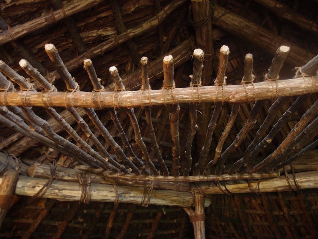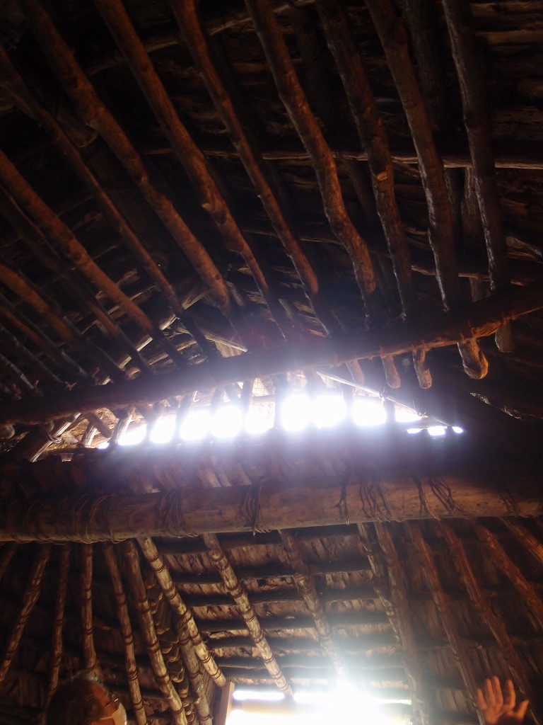 写真7は、屋根とこれを支える横木の骨組みです。下が入口で、上が三角の開口部でここから煙が出ます。木々はふじツル等で締められています。