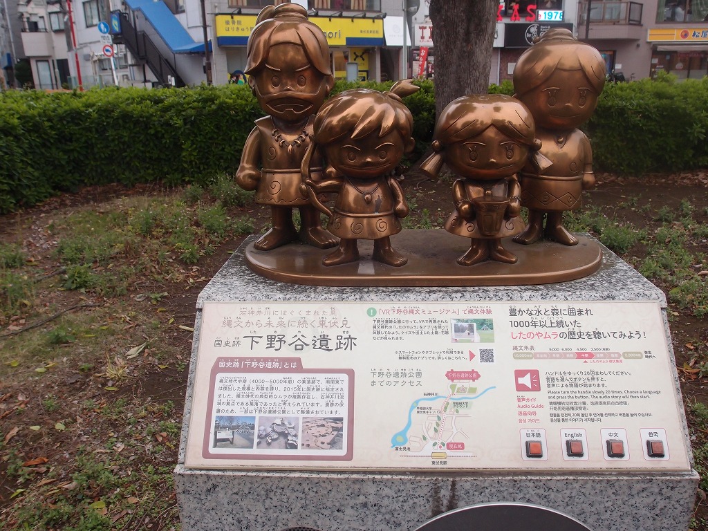 写真1は、西武線東伏見駅南口広場に設置してある「縄文モニュメント」です。舌のハンドルを20回回転させると本遺跡の音声説明がされます。
