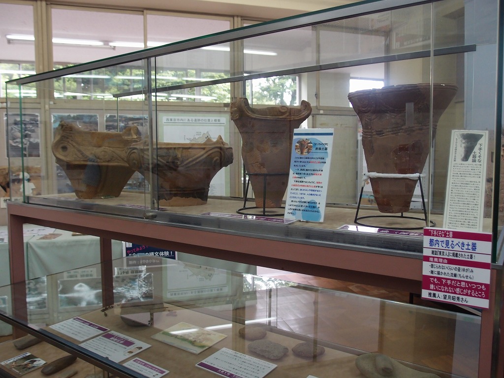 公園での遺跡見学後、西東京市郷土資料室(西東京市西原4-5-6)に移動し、遺跡の埋蔵品を見学しました。写真17は、土器展示で、一番右のはご覧のように歪みがあり、「下手くそな」土器と称せられています。この左のは、口縁部は曽利式土器の特徴、胴部の文様は連弧文系土器の特徴と、異なる複数の特徴が混ざる土器、即ち折衷土器です。