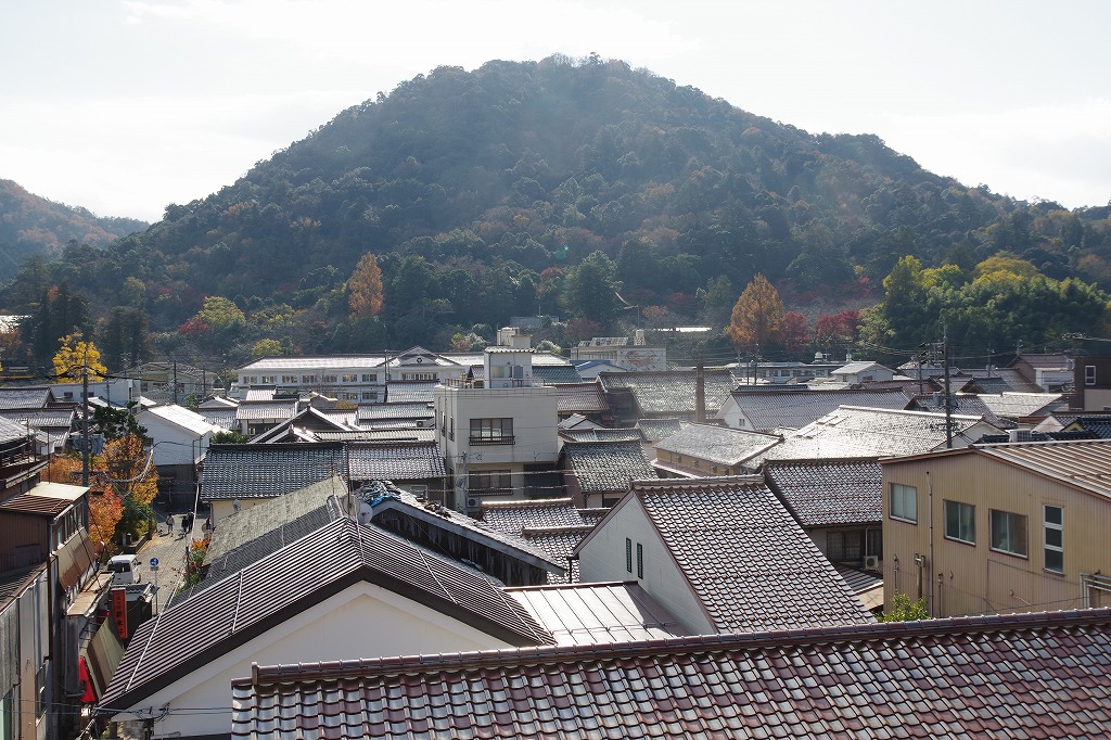 写真2は、土蔵群北側の展望台上から南に打吹山を望んで撮った土蔵群で、3階建てコンクリート建物の先です。