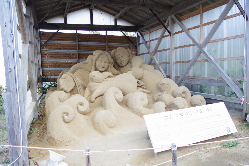 写真12は、神社入口にある因幡の白ウサギ砂像です。